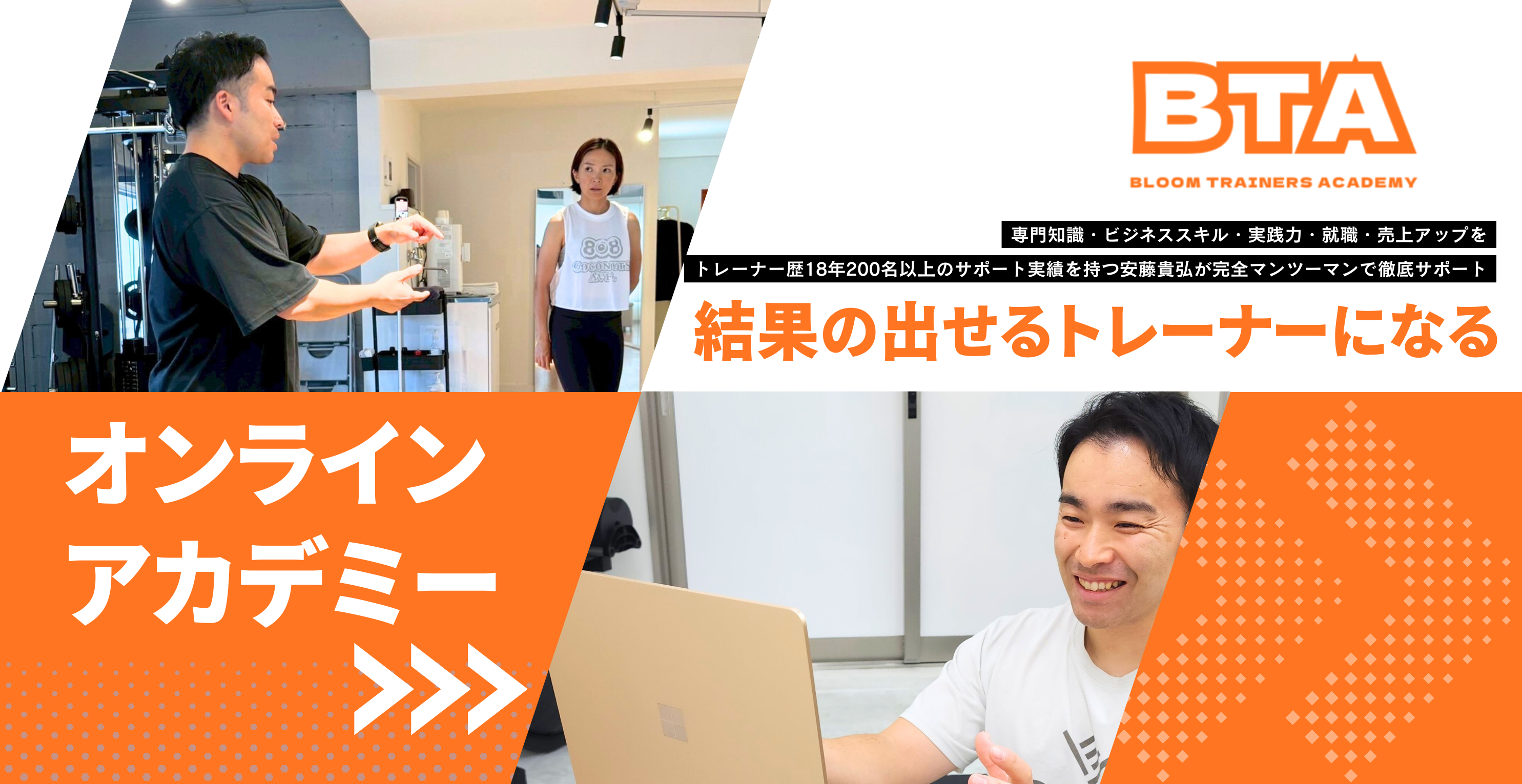 この課題を解決すべくBTAでは知識技術習得、ビジネススキル、就職サポート、そして卒業後でも相談できる環境の用意をし、トレーナー人生全てにおいてサポートできるオンラインアカデミーとして誕生しました。